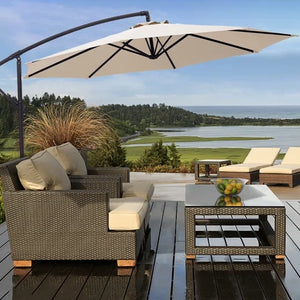 Pole Material : Surface of this Patio Offset umbrella’s metal parts are powder coated with rust resistant covering to defend all kinds of weather. (Ms powder coated metal frame)