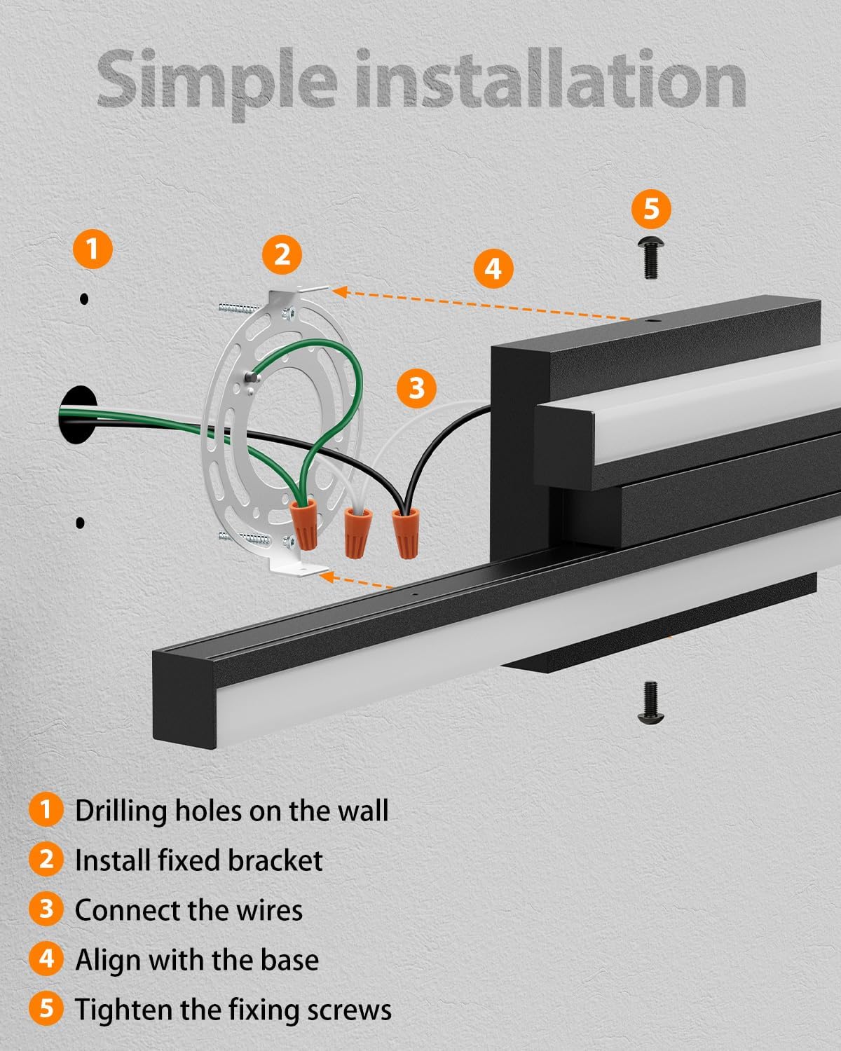 The black vanity light emits 2000 Lumens brilliant light at 5000K daylight white with 120-degree beam angle, great for primary lighting or accent lighting. Equipped with top-rated dimming technology, our LED bathroom vanity lamp is compatible with most dimmers in the market, offering a smooth dimming control from 100% to 10% without flickering or buzzing. You can adjust the ideal brightness with CCT 5 level (2700K/3000K/4000K/5000K/6000K) for different occasions or ambiance.