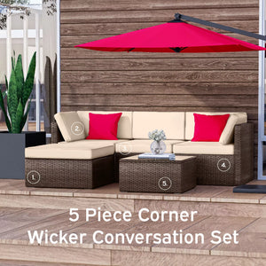 5 Piece Patio Furniture Set: Outdoor patio set with outdoor sectional includes 2 corner chairs 28.75"" W x 28.75"" D x 25"" H; 1 middle chair 25"" W x 28.75"" D x 25"" H; 1 ottoman 28"" W x 28.75"" D x 13.5"" H; and tempered glass top coffee table 25 W"" x 25 D"" x 13"" H. Outdoor sofa 82.5” x 28.75” with all 3 chairs combined.