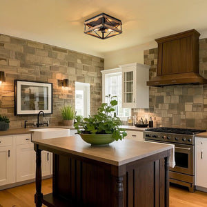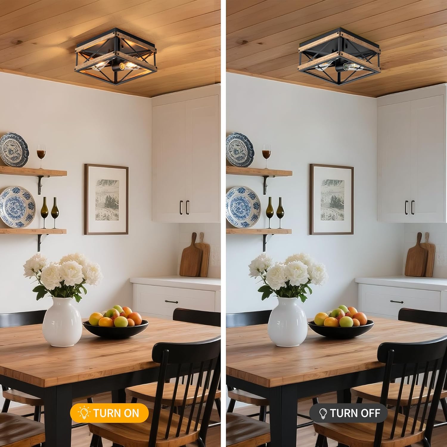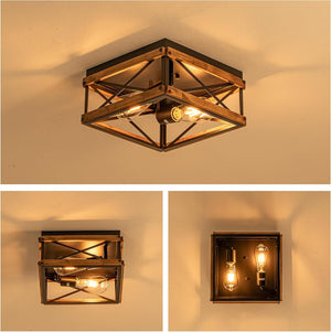 The rustic flush mount light fixture is a perfect combination of wood and metal. X-frame structure and wood decoration provide a retro style and unique look for updating your home. Ceiling Light fixture features piano paint process, beautiful and durable.