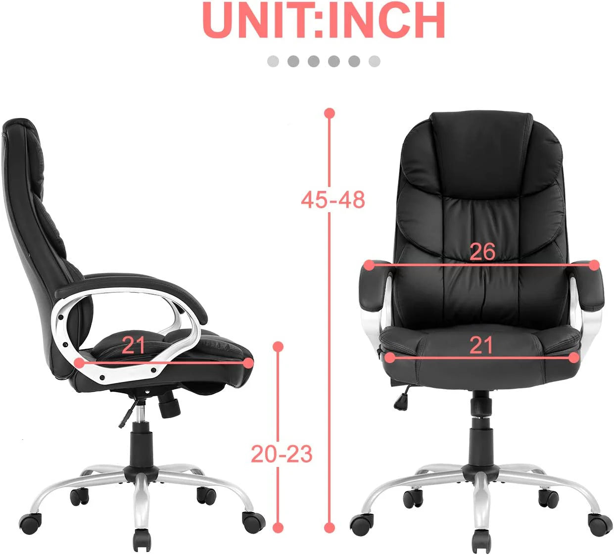 The ergonomically curved high back perfectly supports your whole body. The thick cushion is padded with a high-density shaping sponge that is soft and comfortable for long-term use. This chair was designed for your comfort. It is suitable for the office, gaming room, living room, bedroom, study, etc. It will make your space more modern and elegant.