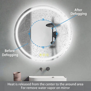 The LED bathroom round mirror features a modern design with frameless frosted edges, gently illuminating your face while adding artistic detail to your space. An innovative defogger keeps the glass clear at all times. The high-quality LED light has a long lifespan, making it more durable and ensuring excellent clarity every time. The mirror is also suitable for bedrooms, closets, or hallways.